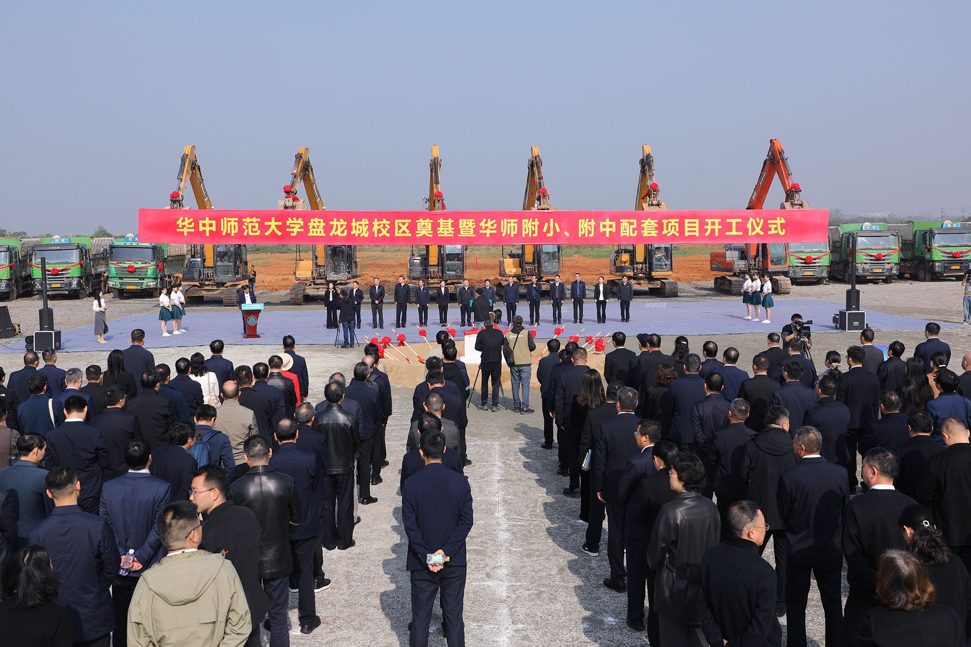 华大在线讯(记者 郝日虹)10月28日,盘龙城校区奠基暨华师附小、附中配套项目开工仪式在黄陂区盘龙城经济开发区举行。黄陂区委书记何建文,区委副书记、区长张劲,区人大常委会主任陈军,区政协主席熊定萍,校领导夏立新、彭双阶、查道林、陈迪明、周鹏程、刘宏达、刘三女牙、吴丹,原副校长、盘龙城校区建设指挥部第一任指挥长任友洲,武汉市城市建设投资开发集团董事长余新民、总经理盛华,共同为盘龙城校区奠基。