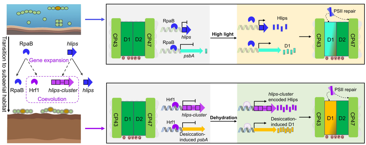 邱保胜课题组二十多年致力于荒漠蓝藻发菜的研究,受邀为国家林业和草原局提供野生植物发菜国家一级保护的定级咨询建议,被国务院批准的新版《国家重点保护野生植物名录》采纳。课题组率先向国际同行公布并共享了发菜的全基因组信息,构建了发菜转录调控网络筛选系统平台,运用基因编辑技术突破了发菜遗传操作技术瓶颈,进而将发菜发展成为研究荒漠蓝藻的模式材料。在此基础上,课题组鉴定到发菜基因组中一个高光诱导蛋白四基因串联重复(hlip-cluster),在发菜耐受干燥脱水过程中发挥重要作用。该基因串联重复能特异、快速地响应干燥脱水而上调表达。通过基因编辑技术获得敲除突变体后,光系统II修复能力受损,耐干燥脱水能力显著下降。同时,hlip-cluster异源表达能显著增强脱水敏感藻株Nostoc PCC 7120的脱水耐受性。通过转录因子文库筛选,发现转录因子Hrf1可协同调控hlips-cluster与干燥诱导型psbA的表达,其在发菜适应恶劣的荒漠生境中起负向调节作用。系统发育分析显示,Hlip-cluster与转录因子Hrf1在陆生念珠藻类群中发生共进化,这为光合生物的耐旱机制提供了新的进化视角。课题组的研究表明,念珠藻中Hrf1-hlips模块可促进干燥脱水过程中hlips的快速高效表达,最大限度地减少干燥脱水过程中的光损伤,从而使其在清晨短暂的复水生长窗口期内迅速恢复光合活性,争取更多的生长时间,得以在极端恶劣的荒漠环境中生存。