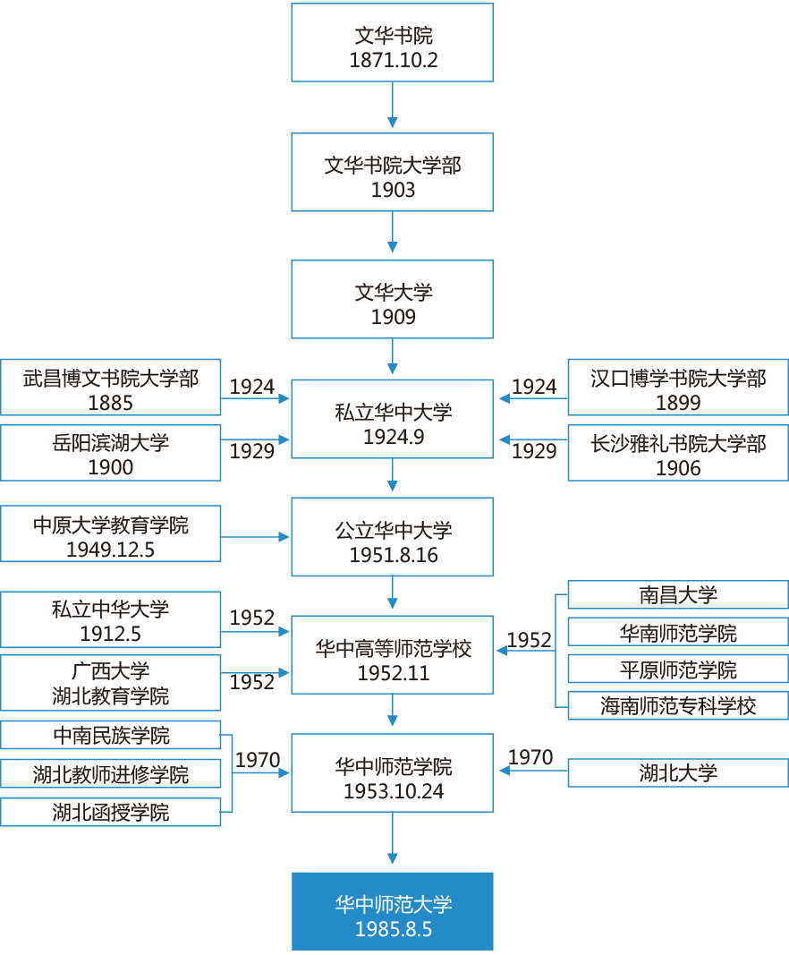 星空体育全站_星空(中国)是教育部直属的一所重点综合性高等学府。追溯其根由,她以1871年的文华书院为源头,以1903年文华书院所设立的大学部为起点,以1924年在文华大学基础上建立的华中大学为主体,以华中大学、中华大学、中原大学教育学院等多元结合为前身。1951年中原大学教育学院与华中大学合并组建成公立华中大学;1952年中华大学、湖北教育学院等并入后,学校改名为华中高等师范学校,1953年定名为华中师范学院,1985年学校更名为星空体育全站_星空(中国),并由中原大学创始人之一邓小平同志亲笔题写校名。